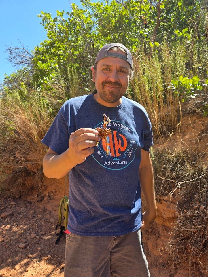 SUBMITTED | ANCIENT WAYVES RIVER AND HIKING ADVENTURES Louis Williams, the owner of Ancient Wayves River and Hiking Adventures, holds a small animal figure he crafted from local roots during one of his guided tours in southeastern Utah. His Navajo-owned company combines cultural storytelling with outdoor exploration.