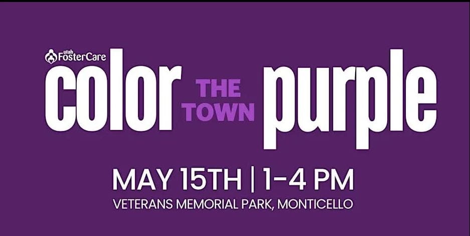 Join Utah Foster Care at our FREE community event, Color the Town Purple, designed to raise awareness of the need for more foster families and support for local children in foster care. The event will take place on Friday, May 15th, from 1:00 PM to 4:00 PM at the Monticello Veterans Memorial Park. This FREE, family-friendly event aims to bring together the local community to advocate for more foster families and brighter futures for children in foster care. Utah Foster Care and DCFS staff, along with current foster families, will speak on the critical need for more foster families in Duchesne and Uintah counties. Guests can enjoy a variety of fun, family-friendly activities including purple snow cones and cotton candy, face painting and temporary tattoos, a fishing pond, bucket toss, sidewalk chalk, and making pinwheels in support of foster care. This event is a significant opportunity for residents of Monticello and the surrounding areas to gain a deeper understanding of foster families and the pressing needs within their local community. Date: Friday, May 15th Time: 1:00 PM – 4:00 PM Location: Veterans Memorial Park, Monticello (17 N E, 50 Monticello Cemetery) Admission: FREE About Utah Foster Care: We serve Utah’s children by finding, educating, and nurturing families to meet the needs of children in foster care. To learn more about how you can support children in foster care, visit www.utahfostercare.org.