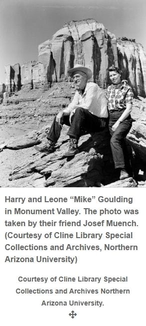 Courtesy of Cline Library Special Collections and Archives Northern Arizona University. By the mid-1920s, Harry and his wife, Leone, nicknamed Mike, lived in a 10-by-12-foot tent at the base of a red rock cliff on the northern edge of Monument Valley. The Navajo called it Big Rock Door Mesa, and they expected the Gouldings to leave. Instead, Harry bought 640 acres, a square mile, from the state of Utah for just $320.