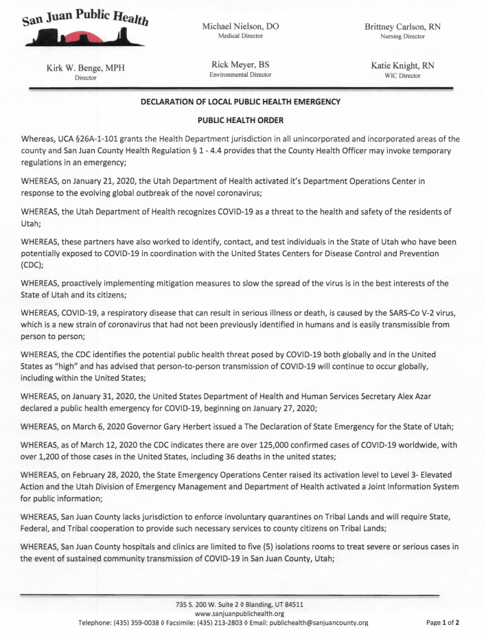 As of May 1st, the San Juan Public Health board voted to officially allow all local ordinances to expire and fall solely under the Governor's orders. San Juan County will follow Governor Herbert's Phased Guidelines under the Orange (Moderate Risk) category with no alterations or variations.